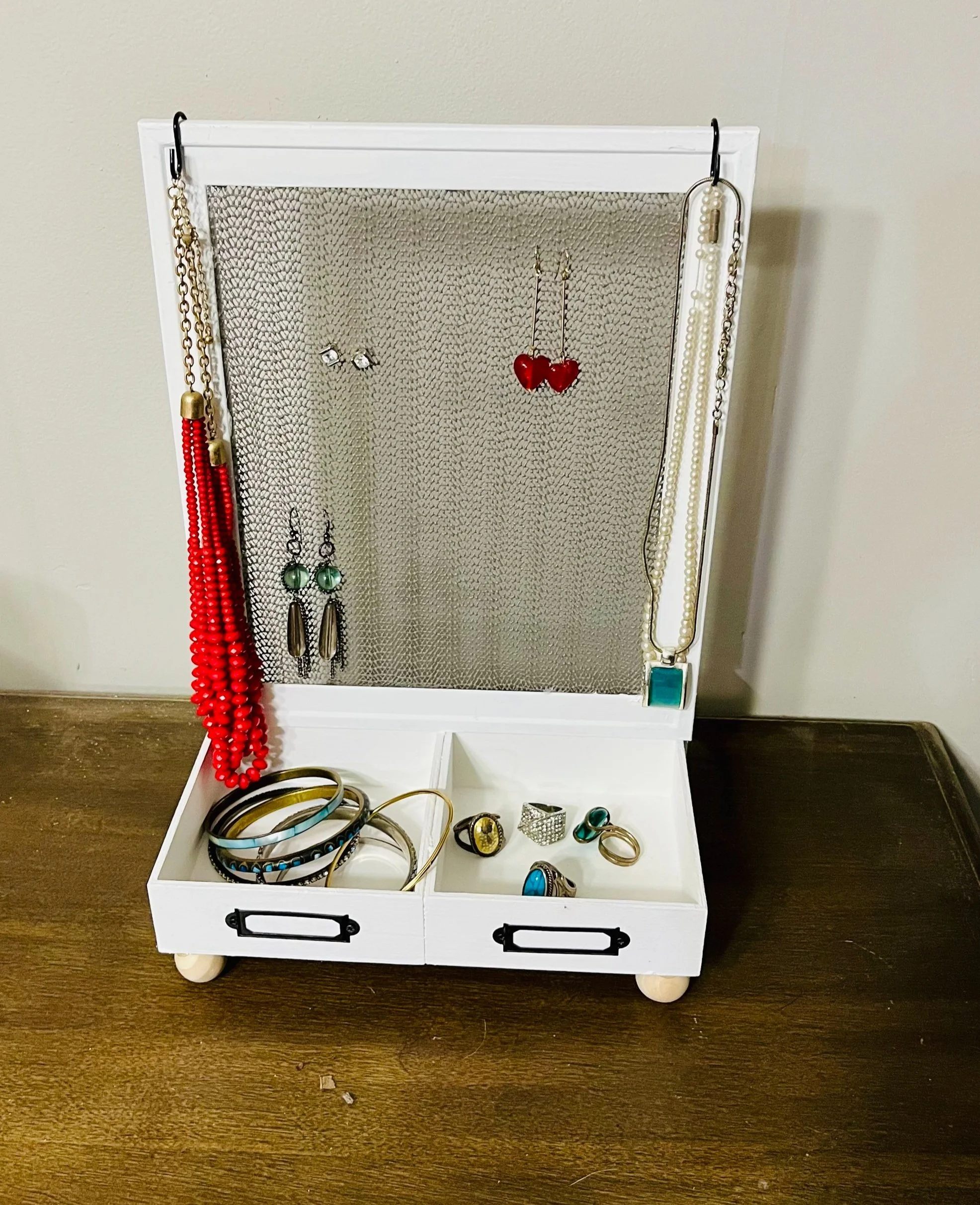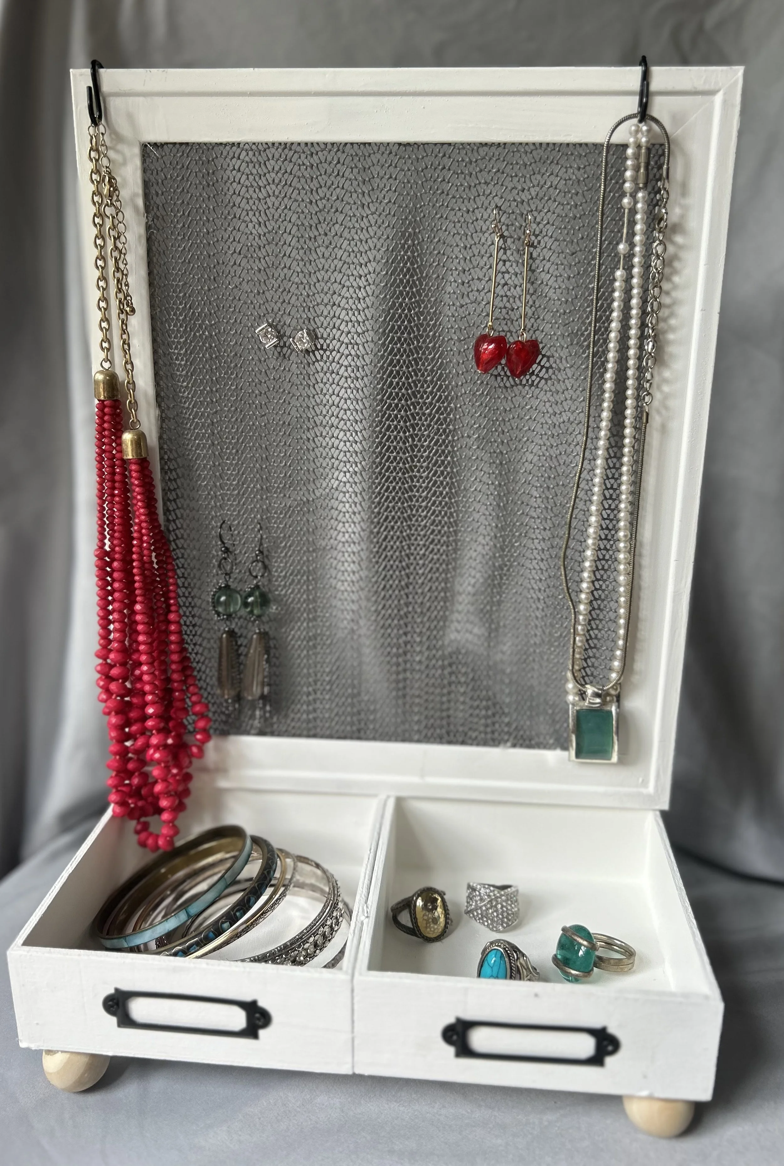Create this functional and unique jewelry organizer. Choose countertop or wall placement accessories, necklace hanger, and paint color. Plus add your personal touch with stencils or trim.