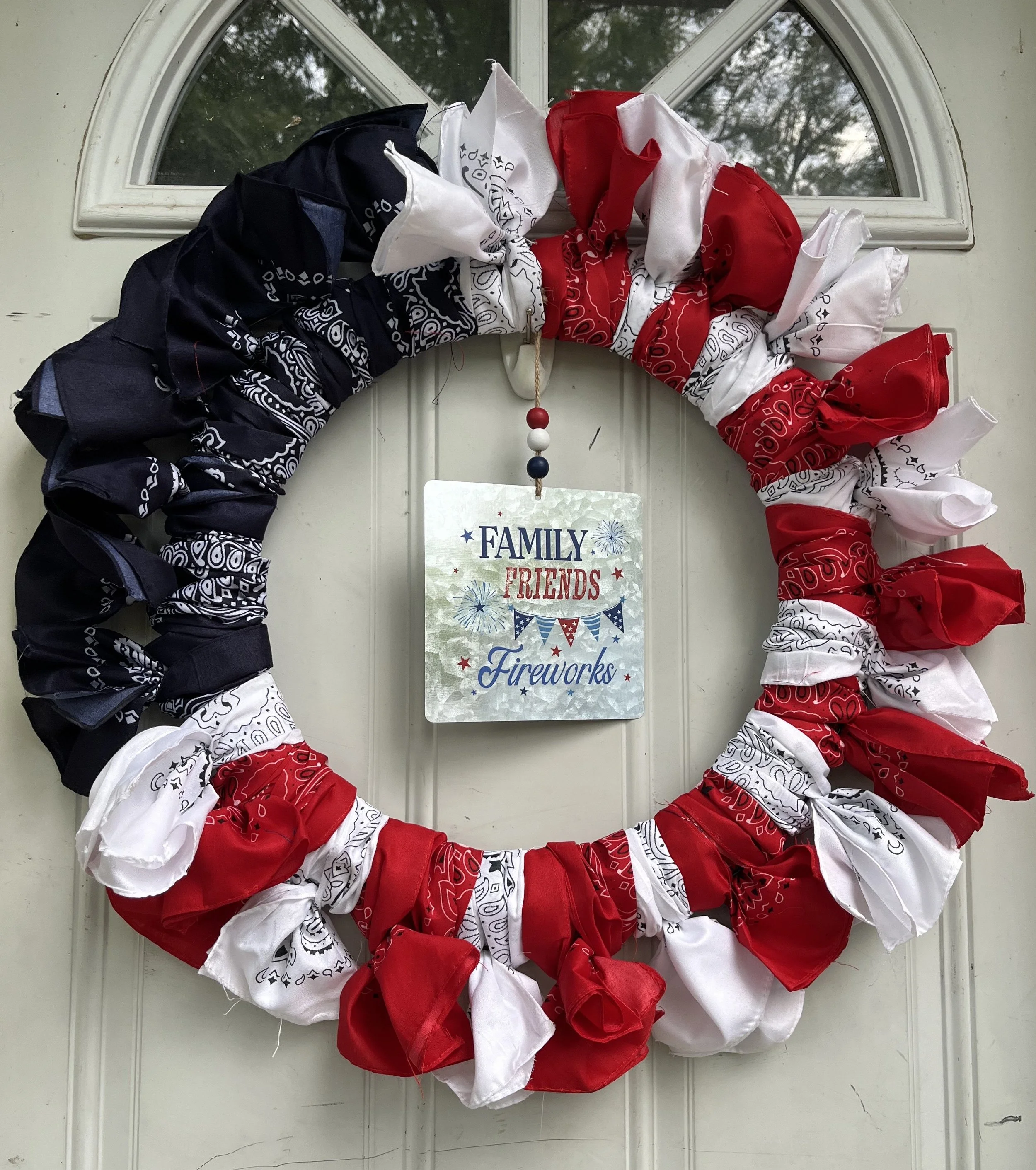 Show your love of the U.S.A. by making this patriotic bandana wreath. You’ll be proud to have it hanging on your front door.